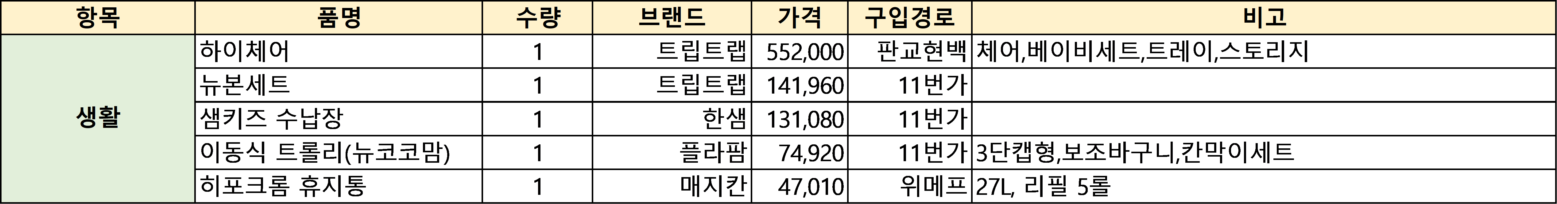하나같이 필요한 생활용품들이다. 아기용품이 많기 때문에 수납장을 늘렸고, 분유를 먹일 때나 이유식을 먹일 때 유용하게 쓴다고 하여 트립트랩 하이체어와 뉴본세트를 준비하였다. 기저귀 휴지통으로 유명한 히포크롬 휴지통도 지금 잘 쓰고 있는 중이다.