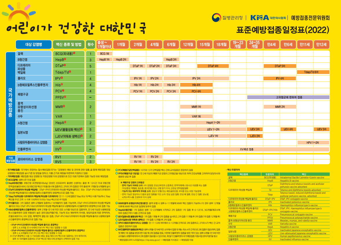 예방접종은 감염병으로 부터 아이를 보호할 수 있는 효과적인 방법임으로, 표준 예방접종 일정에 따라 접종을 이어나가시길 권장드립니다. 만약, 표준 예방접종 일정에 따라 접종하지 못한 경