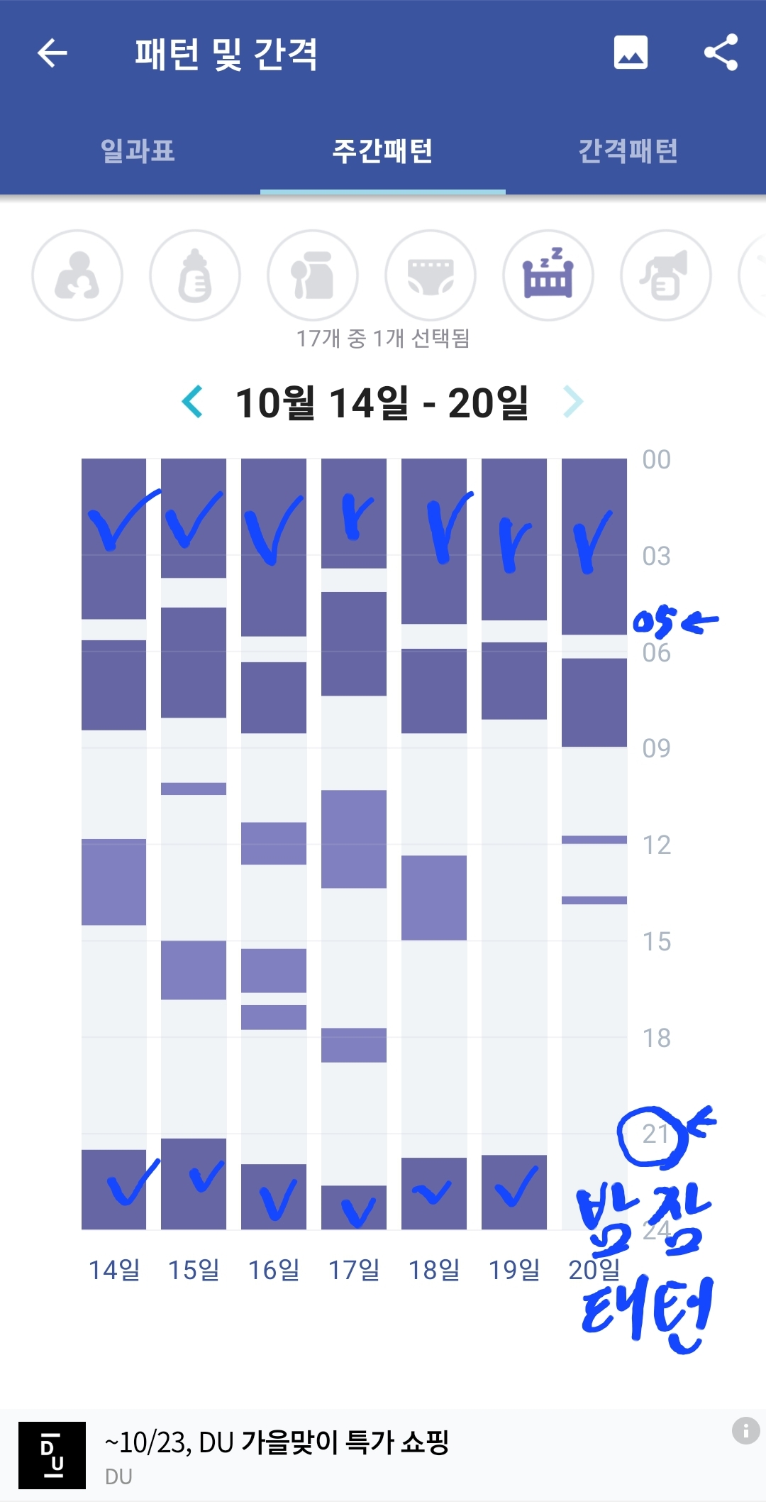 - 50~75일(현재) 최소 6시간은 밤 9시부터 취침 시작하는 패턴을 유지하고 있음