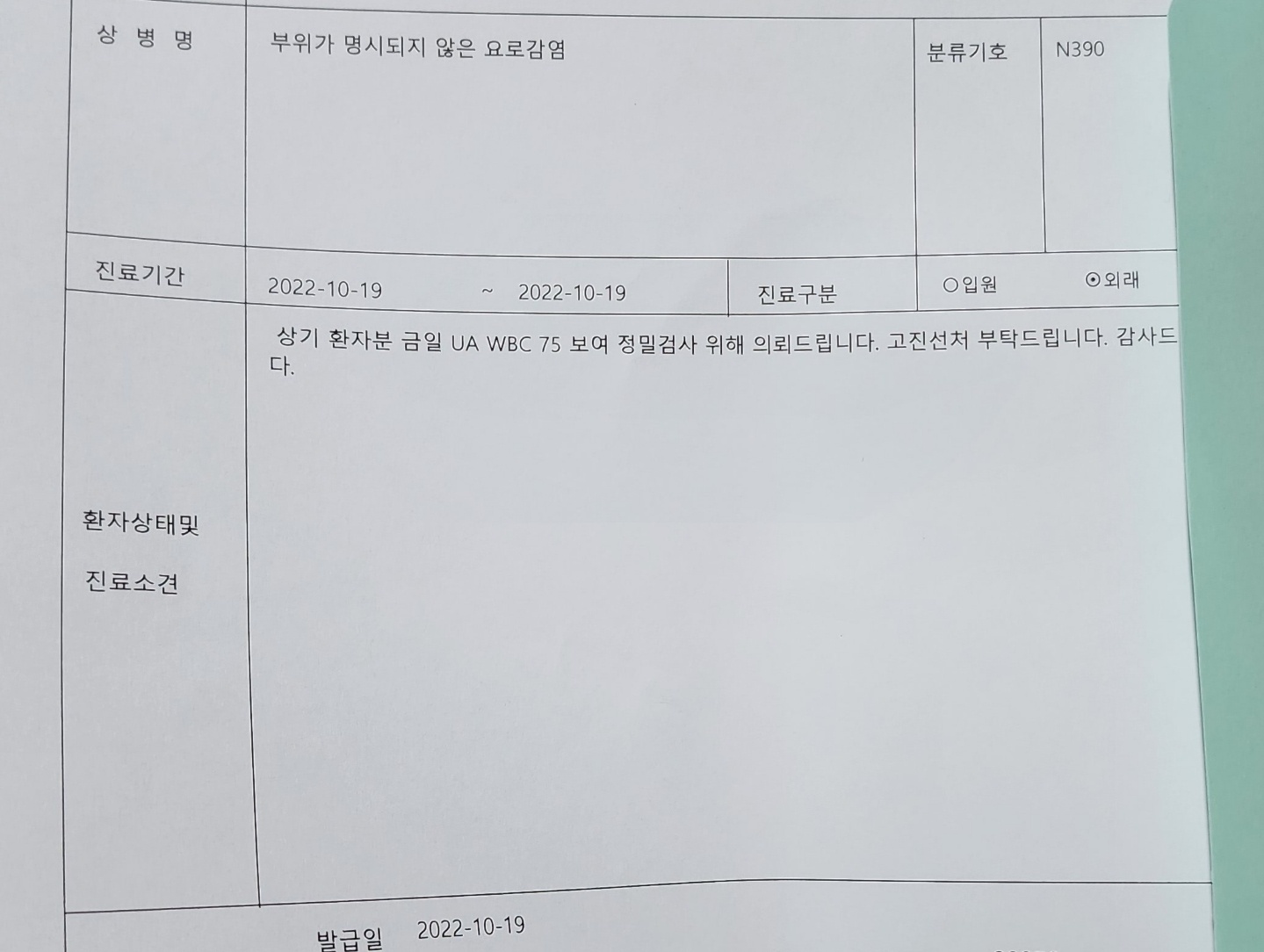 소변 검사 결과는 한 10분 안 걸려서 나왔는데 우려했던 대로 요로감염이라고 했다. 자세히 설명을 듣지는 못했지만 7개의 균 검사에서 5개가 양성이라고 소견서를 써줄 테니 어린 아기의 경우 대학병원 가서 진료를 받아보라고 했다.
