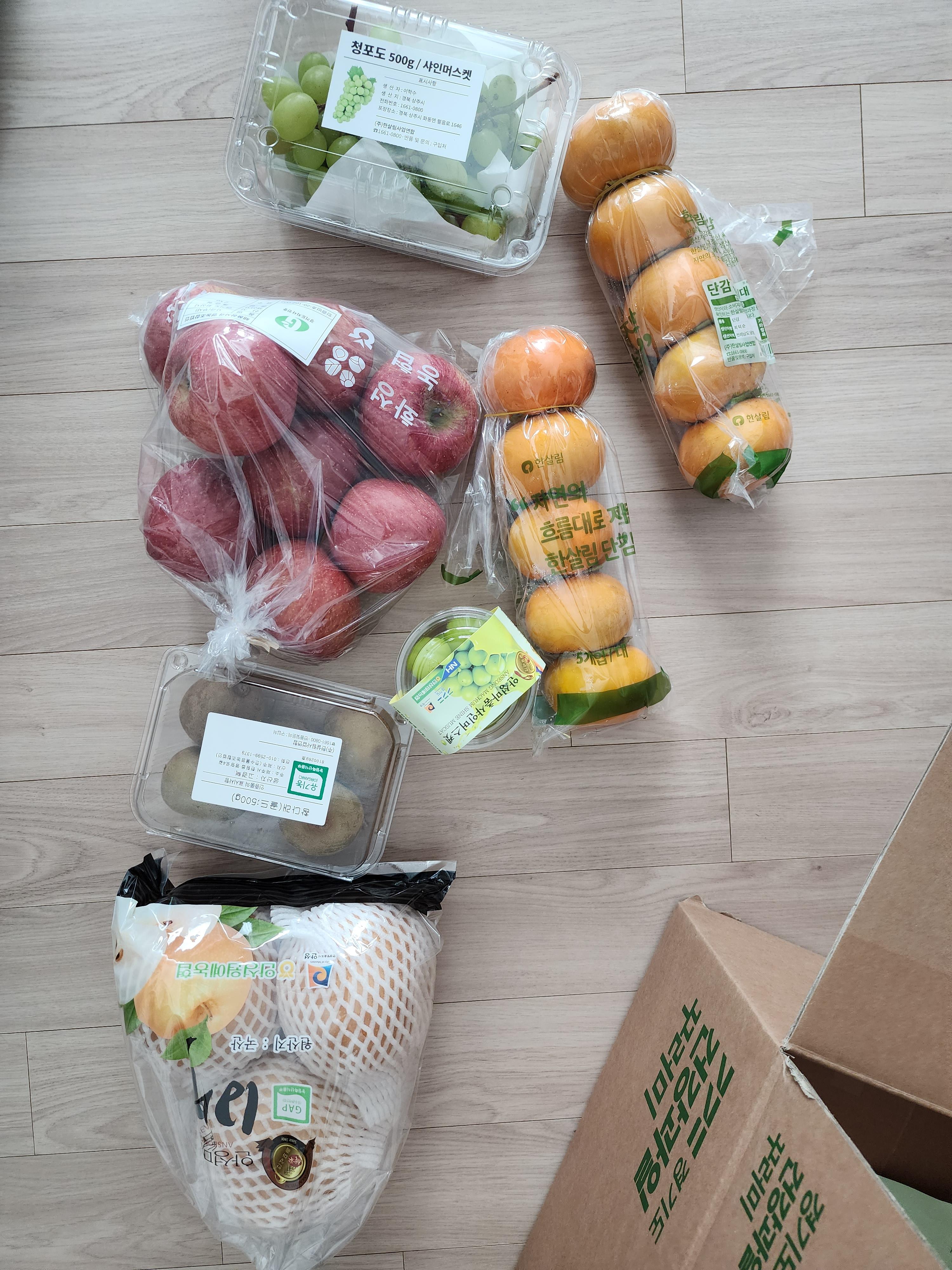 이번에 수령한 과일은 배,사과,감,참다래,샤인머스켓이었다. 곧 호띵이 100일맞이 준비를 해야하는데 일부 과일을 백일상에 올릴 계획이다.