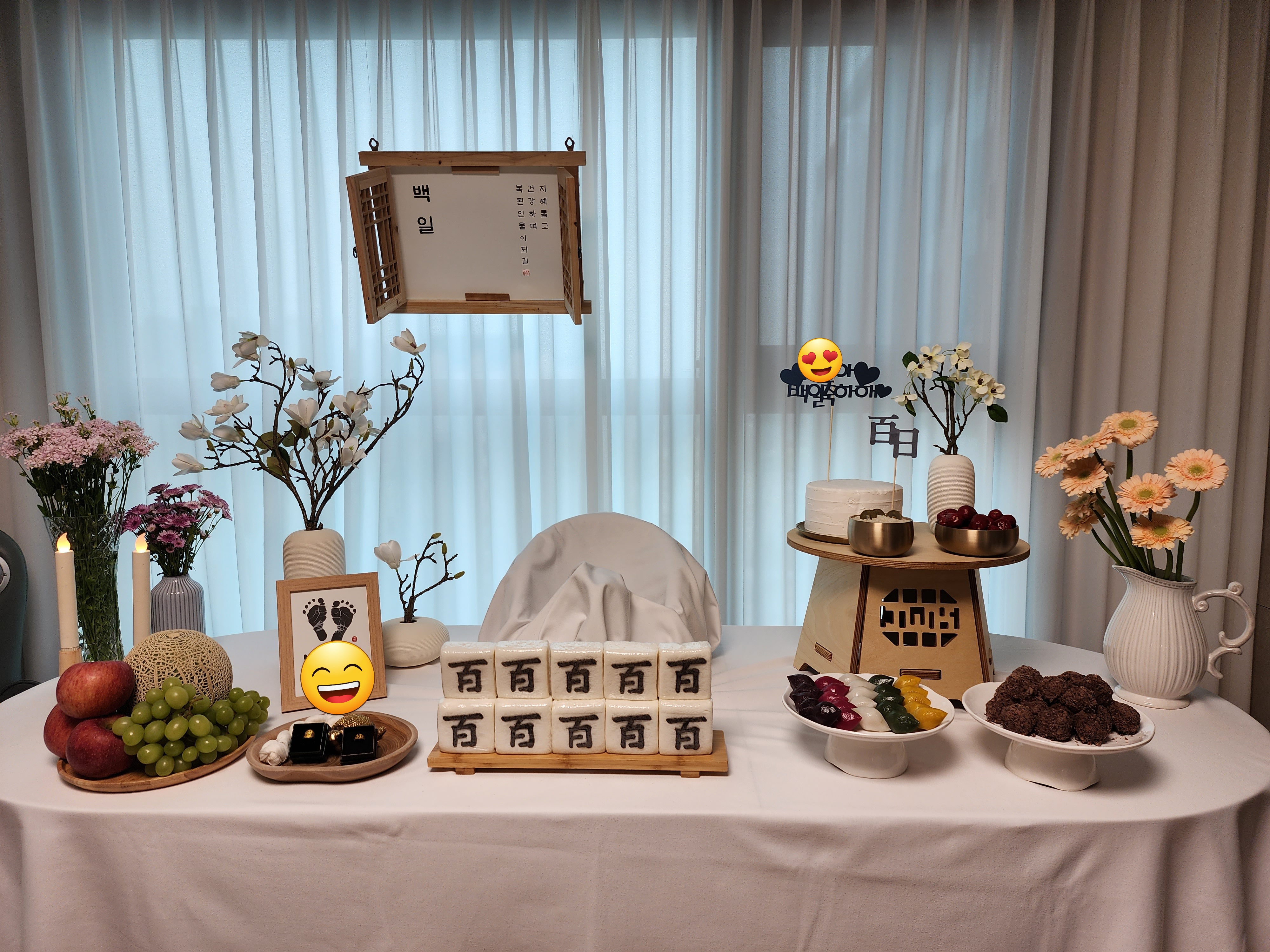 위 사진이 우리가 소품들을 배송받아서 차린 백일상인데 받은 소품들에 집에 있는 생화를 추가해서 향기나는 백일상을 준비했다.