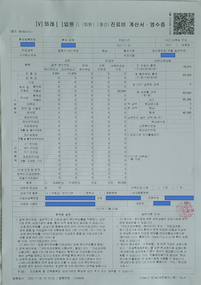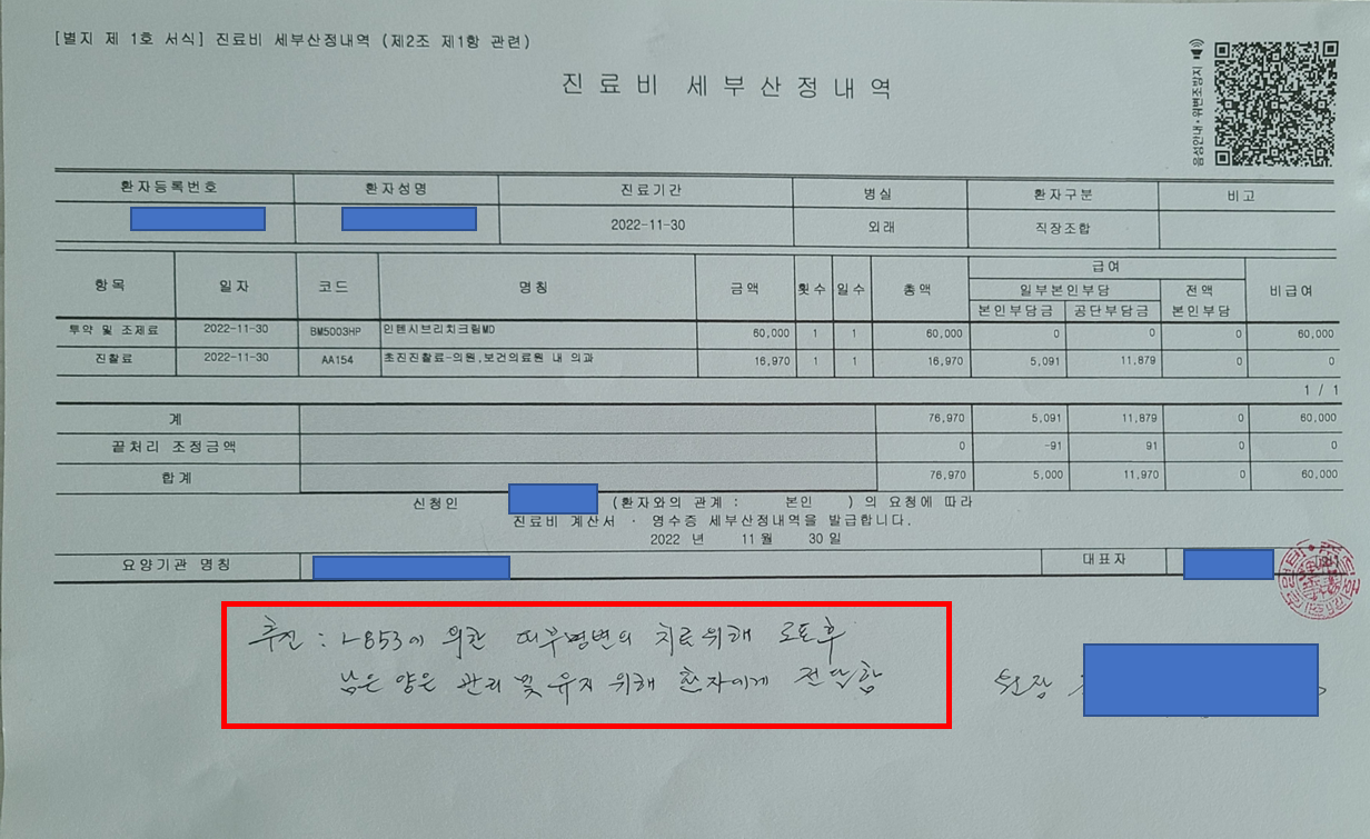 도포 후 남은 양은 관리 및 유지 위해 전달했다는 내용이 필요하다고 해서 진료 시 의사 선생님께 말씀드려 위와 같이 진료비 세부 산정 내역에 관련 내용을 받을 수 있었다.