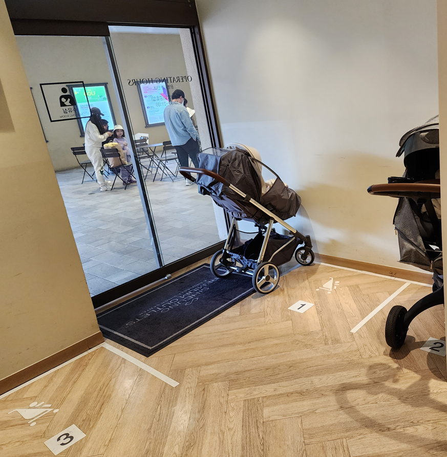 수유실 입구이다. 유모차는 3대가 주차 가능하다고 적혀있는데 휴대용이면 더 많이 주차할 수 있을 것으로 보인다. 입구가 자동문이라 깔끔하다고 생각했다.