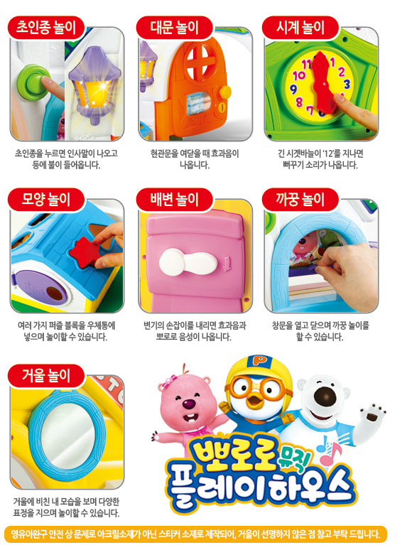- 뽀로로 문짝 : 스스로 앉을 수 있을 때부터 시작해서 기어 다니거나 걸어 다닐 때까지 잘 사용할 수 있을 장난감