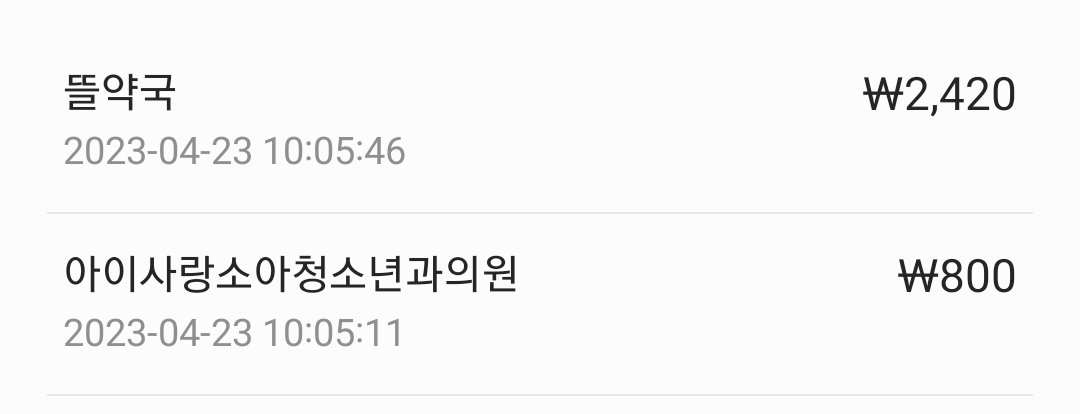 아기 진료비는 800원 (카드계산 가능) 그리고 약국에서 받은 약은 2,420원이었다. 약국에도 나름 대기줄이 길어 약 받는데 약 10분 정도 시간이 소요되었던 것으로 기억한다.