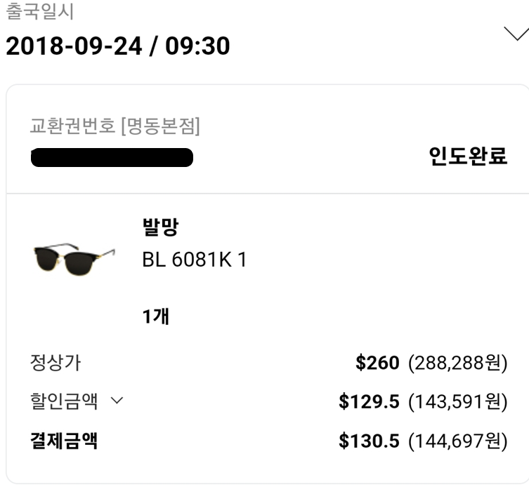 안경테가 부러진 발망선글라스, 구매이력을 찾아보게 되었다. 예전에 구매한 것이다 보니 구매처가 어디인지 찾는게 일이었는데 롯데 면세점에 구매한 이력을 찾아볼 수 있었다.