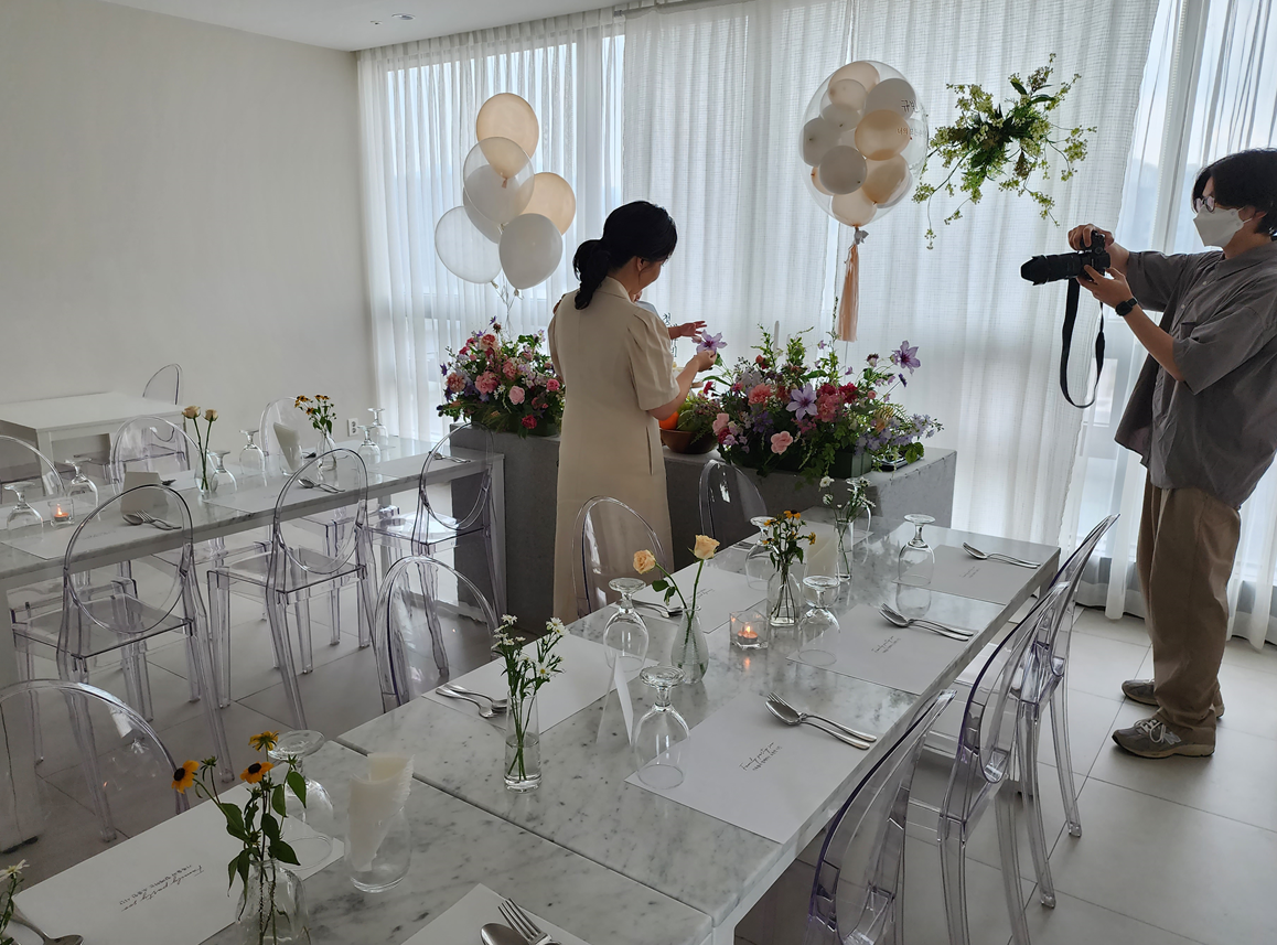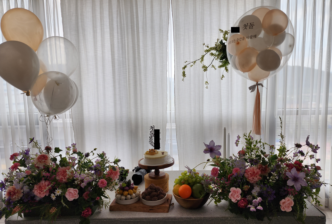 우리 호띵이의 첫생일잔치는 엄마, 아빠, 호띵이 셋이서 먼저 사진 촬영을 진행하며 시작되었습니다. 가든 돌상으로 깔끔하고 예쁜 돌상과 멋진 풍선 장식으로 장소가 아름답게 장식되었습니다. 또한, 시원하고 쾌적한 장소에서 성장 동영상도 문제 없이 재생되었습니다.