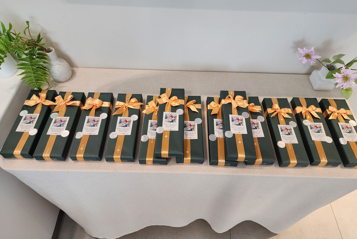 이로써 호띵이의 첫돌을 기념하는 답례품으로 각인된 유기 수저를 선물하여 가족들과 소중한 친지들에게 특별한 감사와 함께 호띵이의 특별한 날을 기념하게 되었습니다. 개별 포장으로 세심하게 준비한 답례품은 가족들에게 더욱 감동을 전할 수 있을 것이라 생각하여 준비했습니다. 박스채로 파티수에 가지고 갔는데 식사를 마칠 때 즈음 위의 사진과 같이 예쁘게 답례품을 정리해주었습니다.