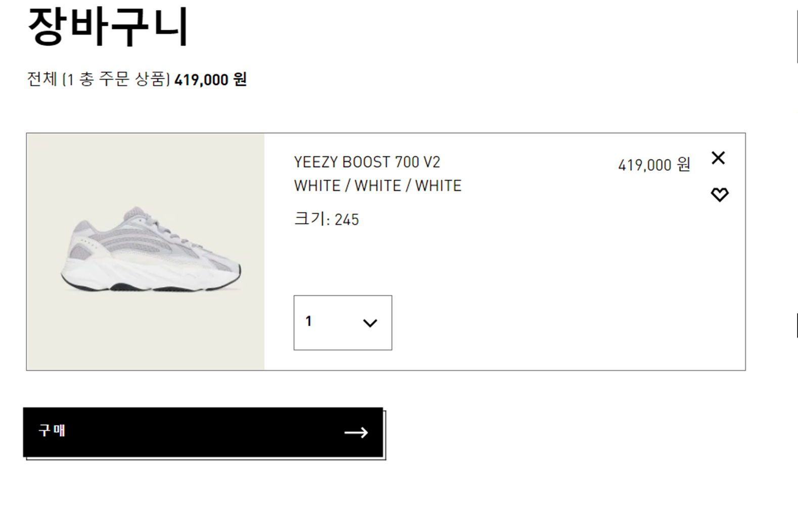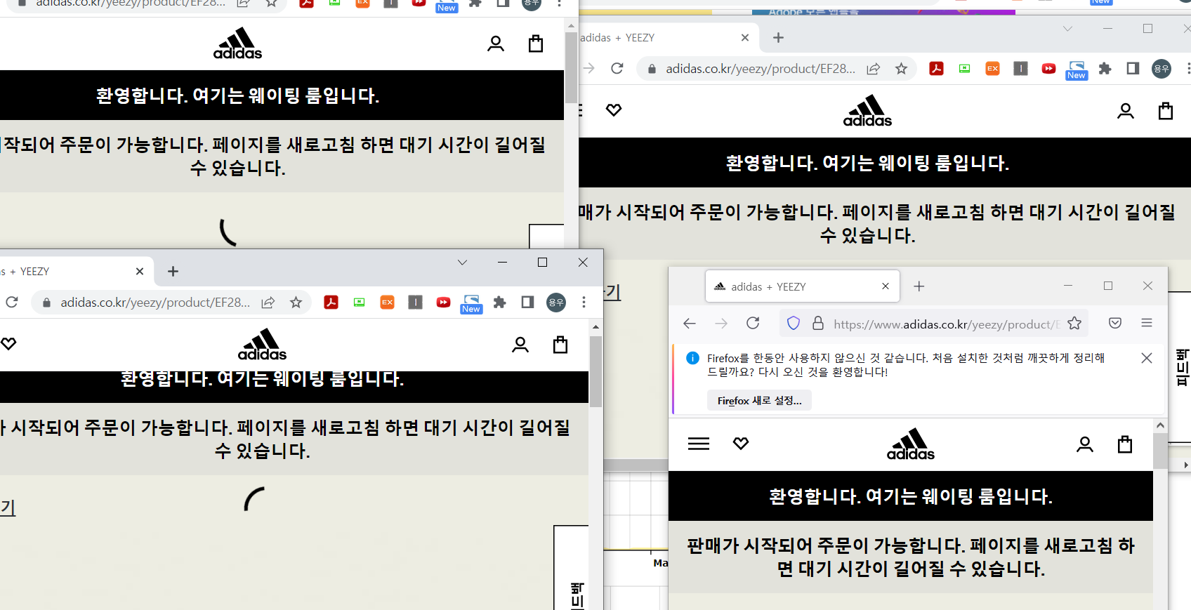 지금도 접속이 되는 아이다스 YEEZY 웨이팅룸은 사이즈 품절이면 품절처리가 되었으면 좋겠다. 현재 8시 29분이 지난 지금 갑자기 웨이팅룸에서 접속이 되었으며 (크롬) 장바구니 까지 들어가졌기에 결제를 바로 진행한 상태이다.