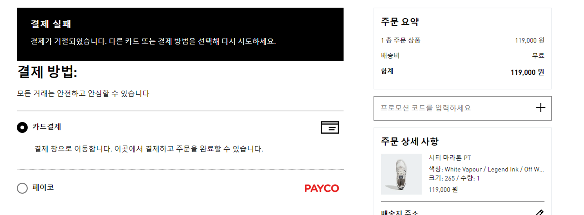 위와 같이 원하는 사이즈가 장바구니에 들어갔고, 결제를 완료 하였다.