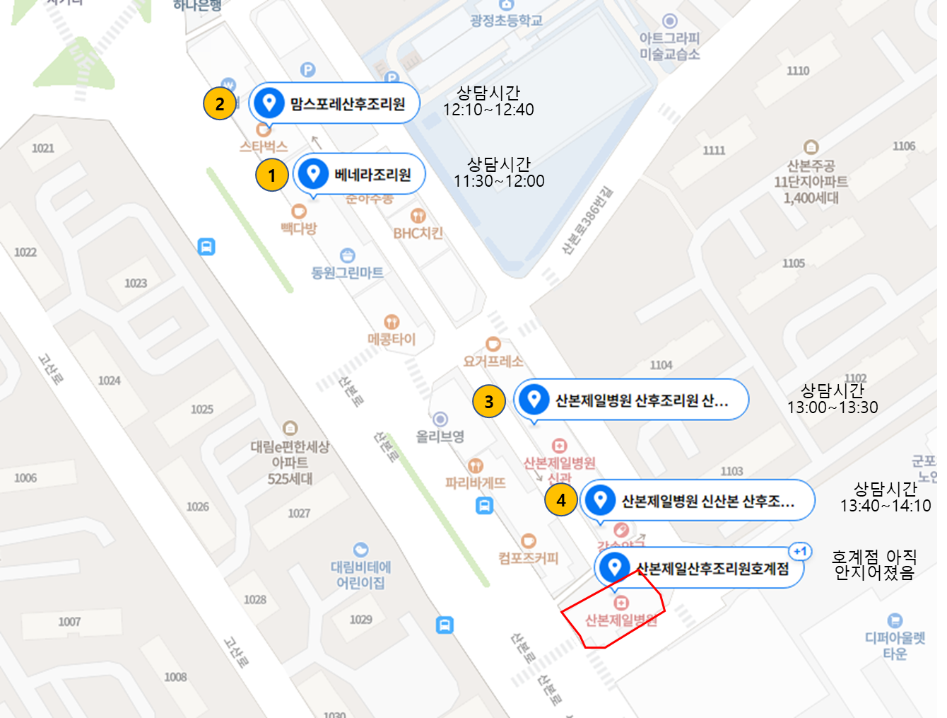 위의 지도 사진과 같이 베네라 조리원 / 맘스포레 조리원 / 산본제일병원 조리원 / 신산본 산후 조리원 이렇게 4개의 조리원에서 차례대로 상담을 진행하였다.