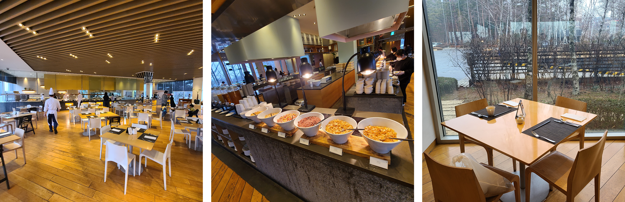 새벽 헬스/스쿼시를 마치고 올라오는 길에 조식 자리를 맡았다. 호띵엄마를 깨워서 내려오라고 하는 중에 식당을 한번 쭉 둘러보면서 사진을 찍었다. 8시 10분이 넘으니 사람들이 좀 많이 왔고 8시 전에는 한가한 편이었다. (7시 50분 즈음 식당에 도착함)