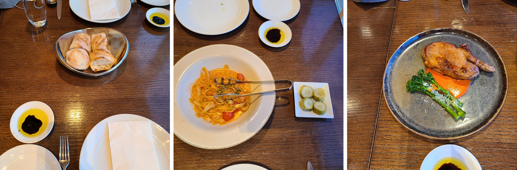 요리를 주문하면 식전 빵이 먼저 나온다. 바삭바삭하고 따뜻해서 맛있게 먹었다. 그리고 시간이 얼마 지나지 않아 파스타가 먼저 나오고 순서대로 돼지가 나왔는데 굉장히 맛있게 먹었다. 피클은 리필을 요청하면 바로바로 리필을 해주었고 음식 맛도 깔끔해서 즐거운 저녁식사를 하였다. 양이 많지는 않지만 오래간만에 새로운 분위기를 느낄만한 요리였다.