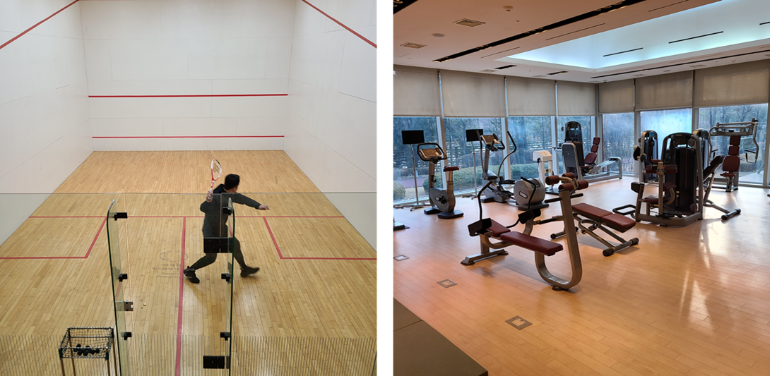 호띵엄마가 호띵이를 뱃속에 품고 있기 때문에 오미크론이 걱정되어 수영장은 이용하지 않았다. 대신에 나만 스쿼시와 헬스장을 이용하였다. 대학교 때 3개월가량 스쿼시를 배웠던 적이 있어 혼자 스쿼시를 쳤는데 스트레스가 약간 풀렸다. 라켓은 호텔 측에서 대여를 해주고 옷과 신발을 따로 챙겨 왔다. 1박 2일 간 저녁 먹기 전/일어나자마자/조식 먹고 총 3번의 스쿼시를 즐겼다.