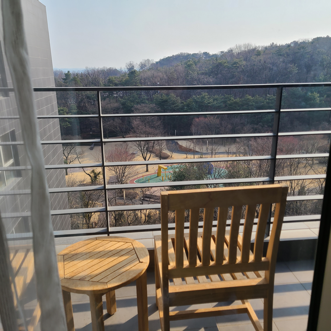 아직 봄이 본격적으로 시작하지 않아서 나무들이 앙상하다. 푸릇푸릇했으면 산책로도 굉장히 좋았을 것 같다. 산책로에 배드민턴장과 족구장 농구장 등이 있었고 아이들이 놀기 좋을 놀이터도 있었다. 체크인 전에 일찍 와서 한번 미리 걷는 정도로 즐기는 것이 좋을만한 산책로였다.
