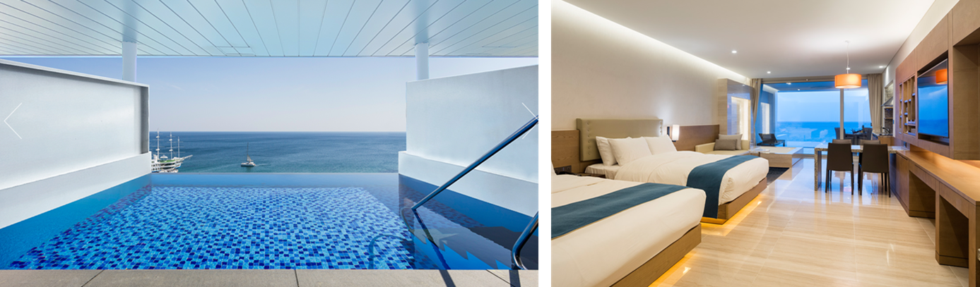 프라이빗 인피니티 풀빌라 개인 수영장 위로 천장이 있어 더욱 프라이빗한 공간을 즐길 수 있습니다. Information 객실예약 객실크기(㎡) 81㎡(24평) 베드타입 트윈 : 슈퍼킹(Super King) 1800mm*2100mm 2개