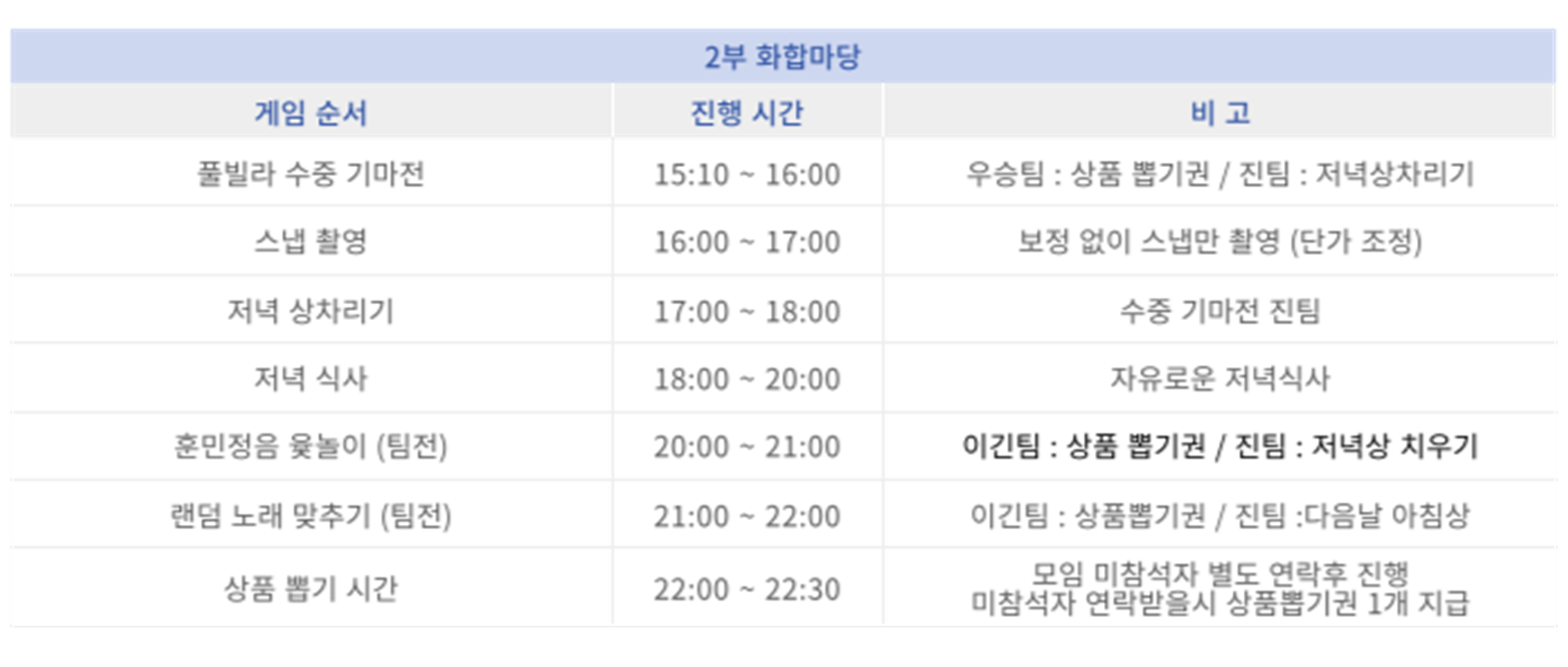오랜만에 만나는 친구/후배 (친구같은 후배들) 라서 설레는 마음으로 이것저것 찾아보고 계획을 하였다. 호띵이가 나오면 더욱 만나기 어려울 것을 알고 있고 내 생애 가장 젊은 날에 한번 더 만나고 싶은 마음이 있기에 재밌게 만남을 가지고자 단체 게임을 찾아보게 되었다. 그리고 계획된 것없이 만나면 만나기전에 기대가 되어도 막상 만나면 시간을 헛되이 보내는 경우가 많았는데 이러한 것을 사전에 방지하고자 시간표까지 짜게 되었다. 앞으로 진행될 만남이 보다 즐겁길 기대하는 바이다.