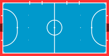 경기장은 직사각형 모양이어야 한다. 국제경기에서 경기장 규격은 길이 38~42미터 사이, 너비 20~25미터 사이를 지켜야한다. 다른 경기에서는 길이 25~42미터 사이, 너비 16~25미터 사이만을 지키면 된다. 경기장의 천장은 최소한 4m 높이에 있어야합니다
