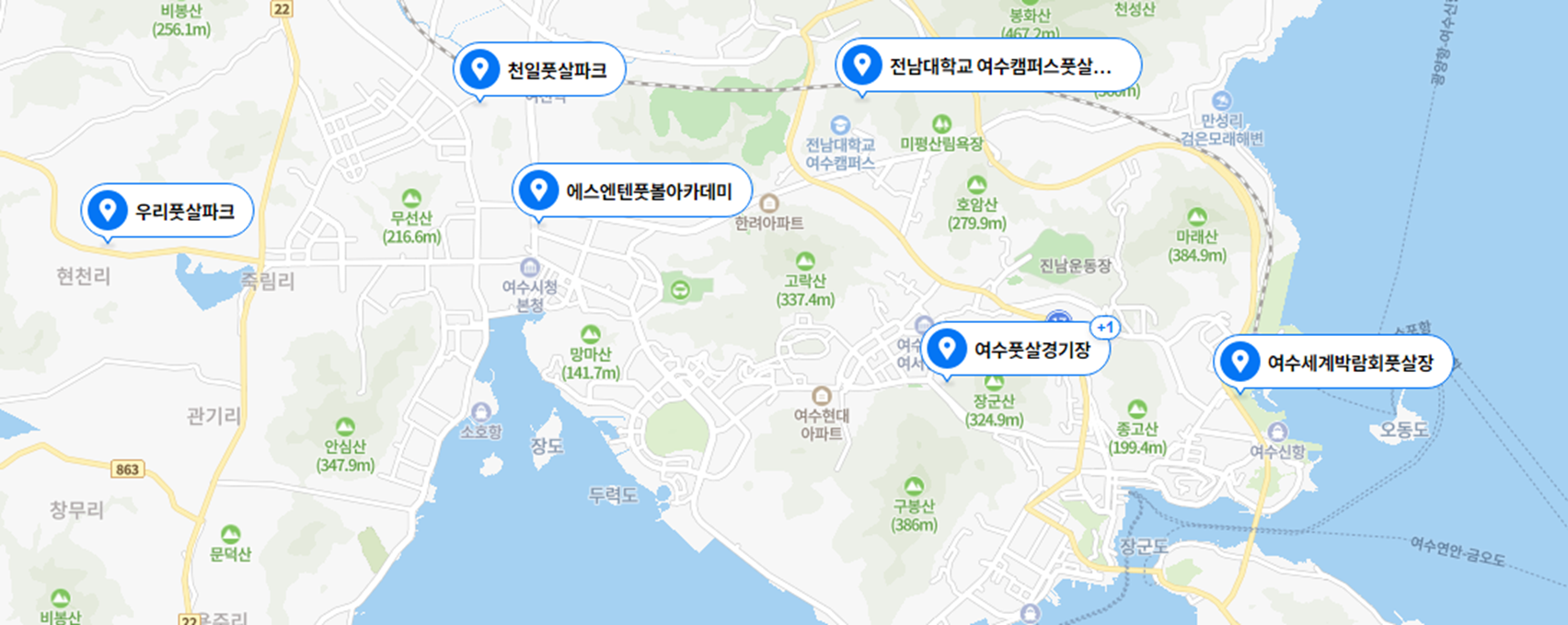 여수에서 모임을 진행하고자 하였기 때문에 여수시에 있는 풋살 경기장을 검색하였다.