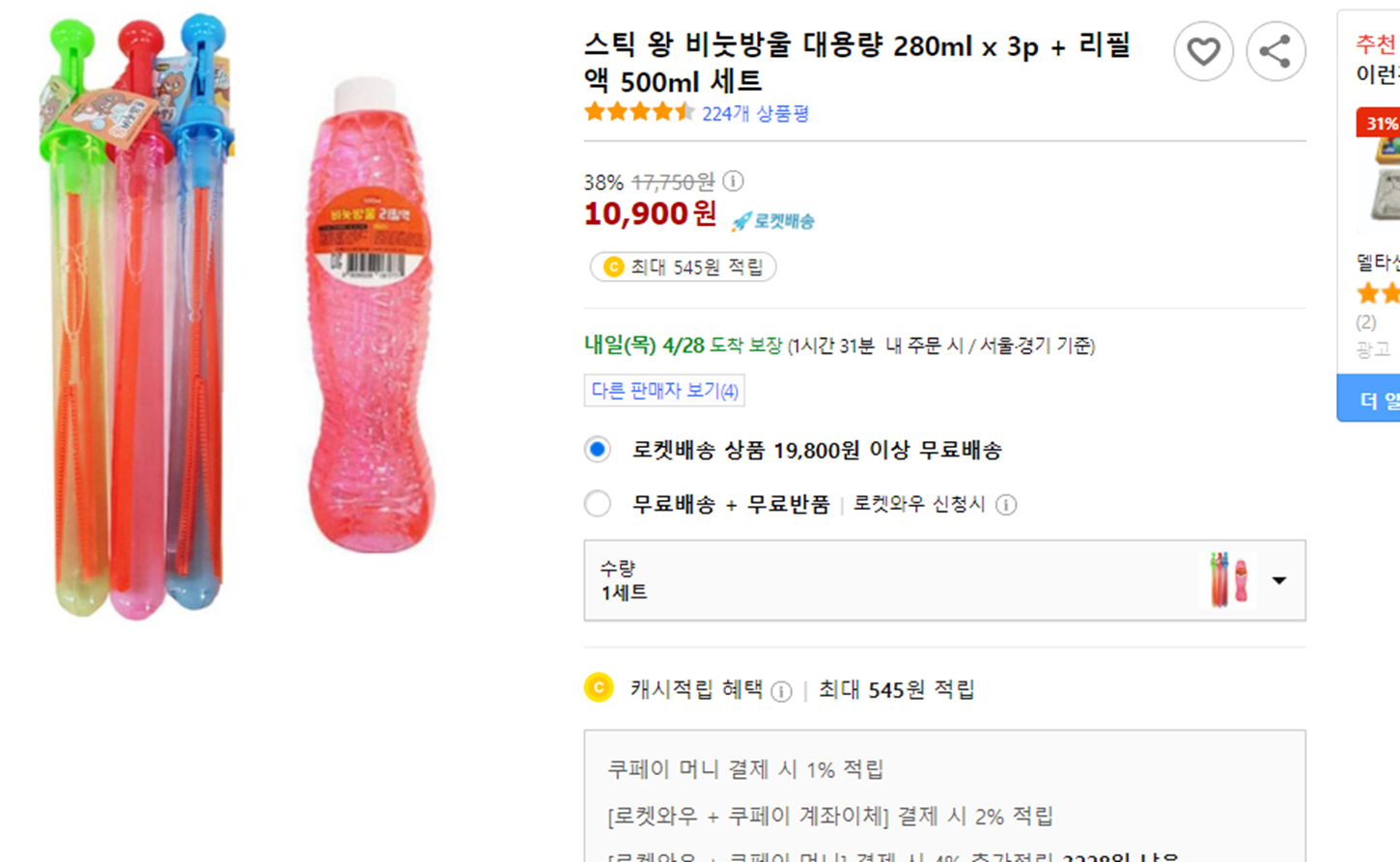 호띵엄마가 비눗방울 보고싶다고 해서 로켓 배송으로 주문중인 비눗방울이다. 대형 비눗방울이라는데 나중에 호띵이가 세상에 나와서도 좋아할 거 같아 미리 호띵엄마랑 사용해보려고 준비한 비눗방울. 우리의 여행을 더욱 빛나게 해주길 기대해본다.