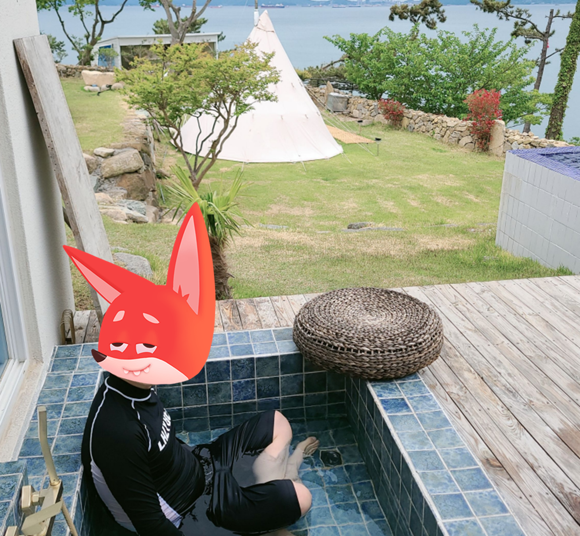 야외 욕조/풀장/의자가 조화롭게 배치되어 있던 실외였다. 라탄 방석도 유용하게 활용하였다. 마당있는 집에 살고 싶었는데 그런 기분을 느끼게 해주었던 숙소였다. 야외 욕조도 저녁 1회 다음날 아침 1회 총 2회 사용하였고 바다를 보면서 야외 반신욕을 즐겼다. (호띵엄마는 양수가 뜨거워지면 문제가 될 수 있어 족욕만 하였다.)