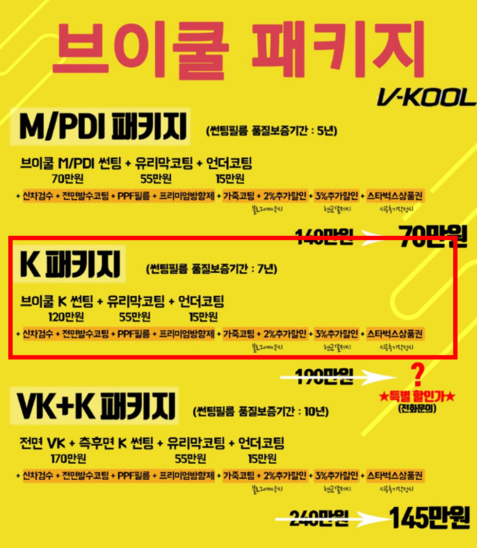 신차검수 + 브이쿨 K 전/측후면 썬팅 + 나데코 유리막 코팅 + 전면 유리발수 코팅 + 가죽코팅 + 언더코팅 + 생활 PPF 필름